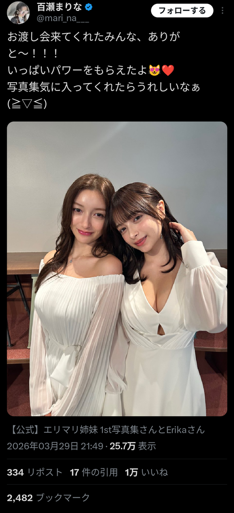 エリマリ姉妹、写真集お渡し会の衣装がセクシーすぎると話題に