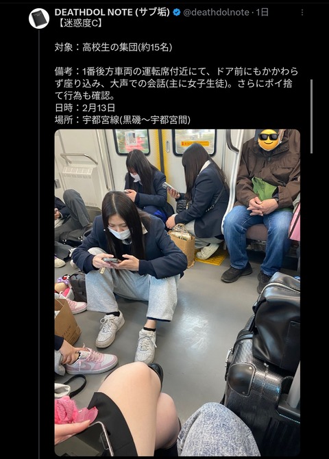 【画像】栃木の田舎JK、電車の床に座り込み炎上